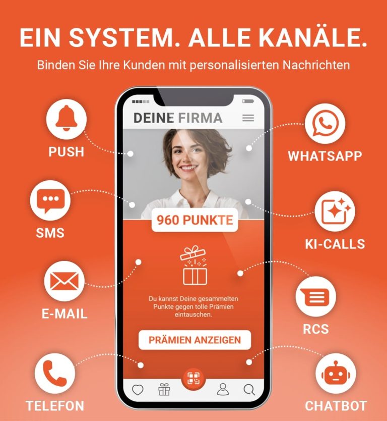 Nutze jetzt neue Kanäle: Erreiche deine Zielgruppe zusätzlich per WhatsApp, SMS oder RCS. Direkt integriert in deine Kundenbindungs-App. So bleibst du immer präsent – ohne Streuverlust.
