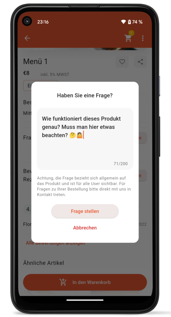 Der Kunde hat die Möglichkeit in der App Fragen zu einen Produkt zu stellen welche vom Unternehmen mittels Admin Plattform beantwortet werden können. Diese Fragen und Antworten sind für alle anderen Nutzer ebenfalls sichtbar.