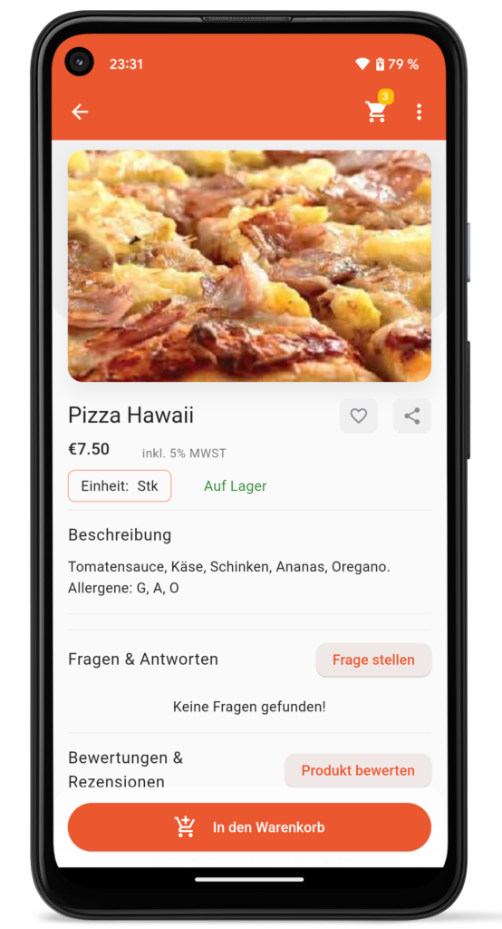 Präsentation der Produkte in der App mit Bildern, Beschreibung und weiteren vielen Details. Ein optionaler Bestellvorgang ermöglicht es Produkte zu bestellen und sogar zu kaufen. Ob Produkte geliefert werden oder im Geschäft abgeholt werden müssen ist bloß eine Frage der Konfiguration.